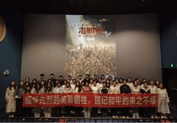电影《志愿军:浴血和平》从志愿军战士的视角还原了战争的残酷与壮烈——从板门店谈判的唇枪舌剑、寸土不让,到上甘岭战役中冲锋陷阵的无畏,再到战士们对祖国、对人民的赤诚牵挂,每一个镜头都直击人心。观影过程中,现场氛围庄严肃穆,不少同学被志愿军“以血肉之躯筑钢铁长城”的牺牲精神打动,悄悄擦拭眼角的泪水;当看到战役胜利、志愿军战士们期盼和平到来的画面时,同学们那份深埋心底的民族自豪感与使命感被深深唤醒。
