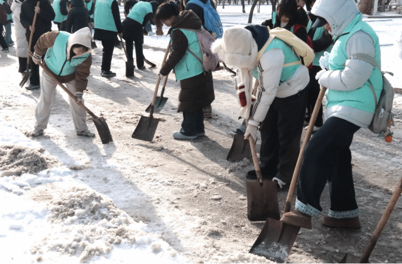 组织24级、25级学生志愿者,在康复楼门前开展铲雪志愿服务活动。