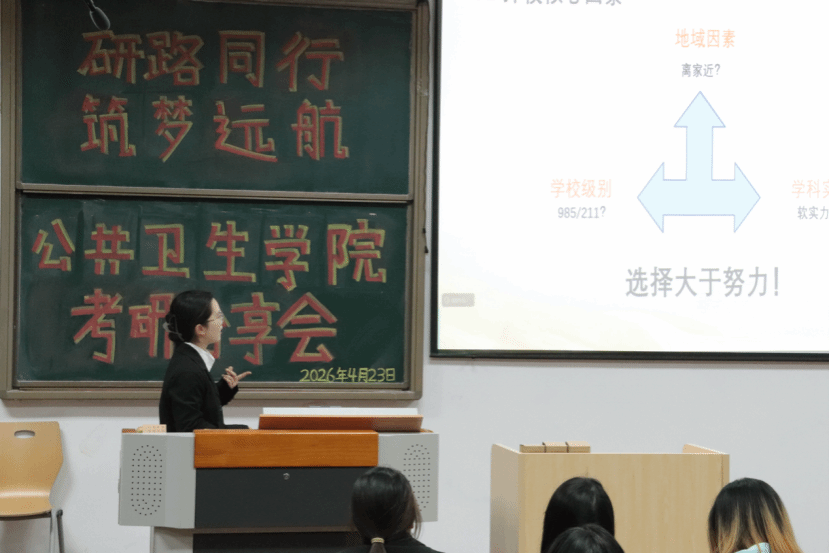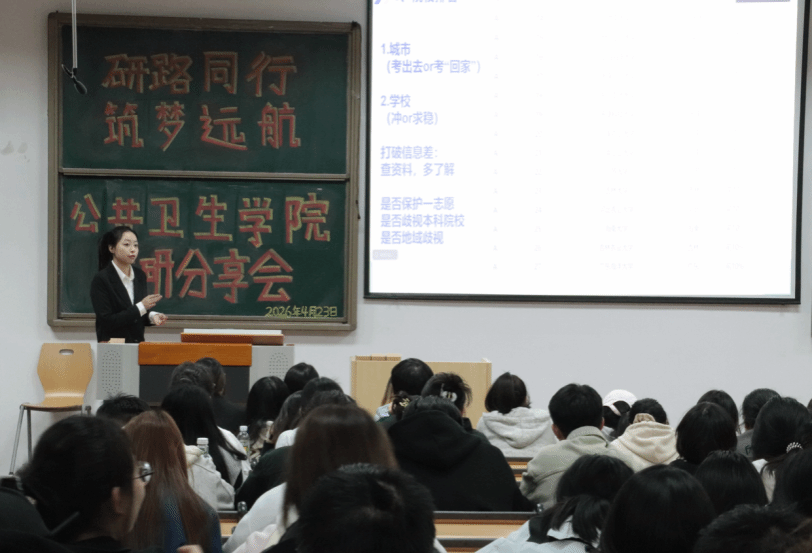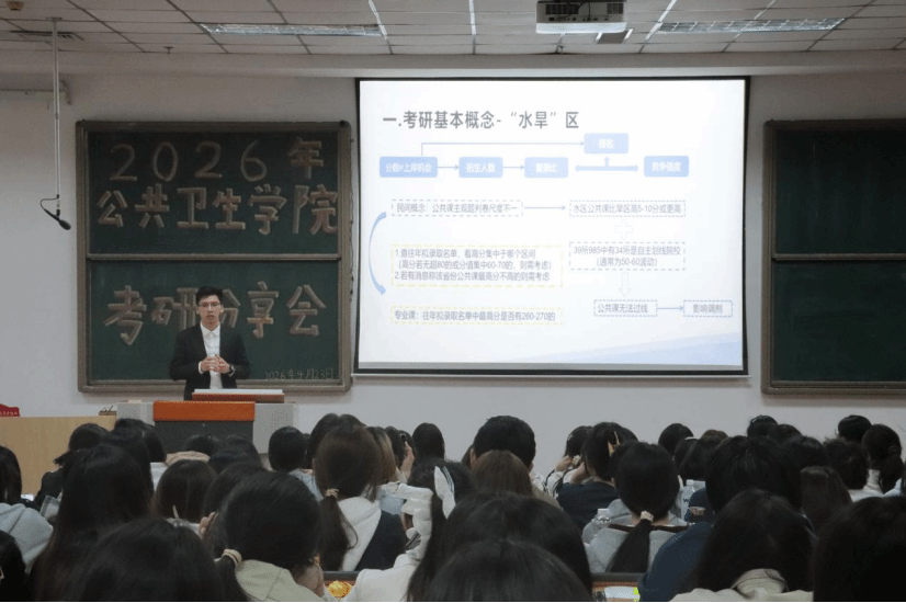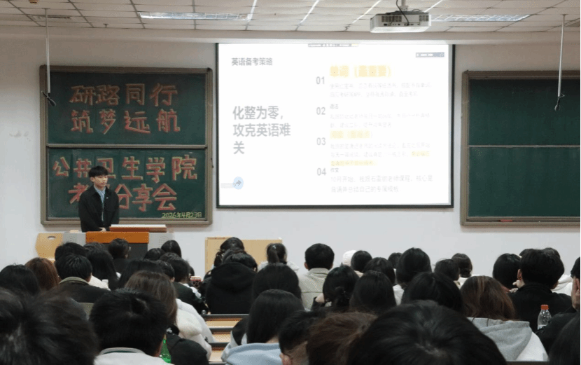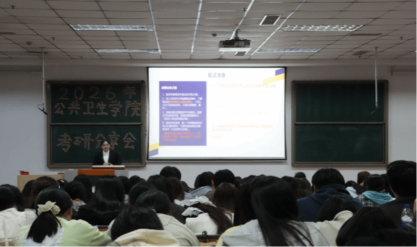 以分专业专场形式,成功举办考研经验分享会。本次活动分为预防医学专场、卫生检验与检疫及食品质量与安全专场,特邀 7 名成功考入国内重点高校的优秀毕业生担任分享嘉宾,为各年级备考学生带来精准、实用的升学指导。分享嘉宾分别被华中科技大学、四川大学、郑州大学、南昌大学、广州医医科大学、上海体育大学、天津科技大学等院校录取,覆盖公共卫生、食品科学与工程等核心专业方向。分享内容聚焦院校选择、复习规划、初试技巧、复试准备等关键环节,兼具针对性与实操性,现场互动热烈、学习氛围浓厚。
